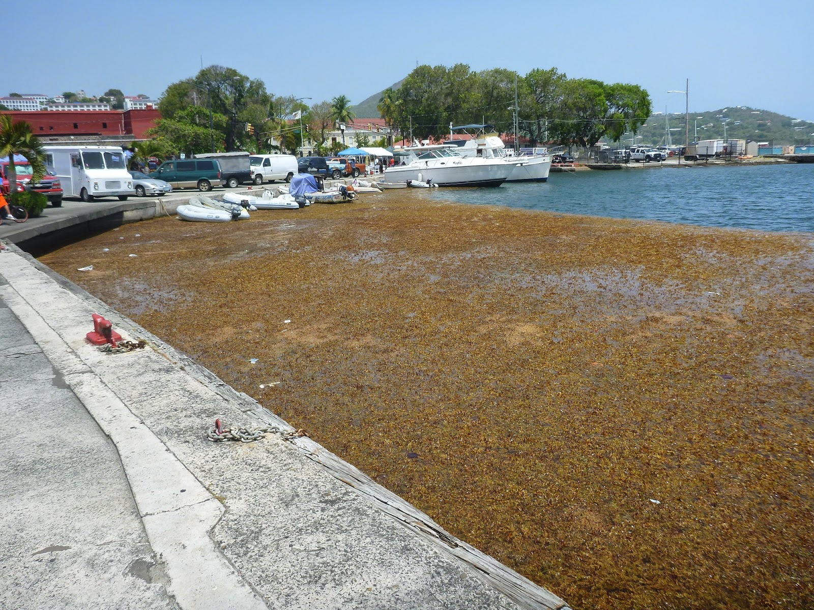 Unfortunately the Sargasso sea weed blew into the harbor as the winds switched for a week to come out of the South and West instead of the normal East. The Marina at Crown Bay was choked with the floating weed.